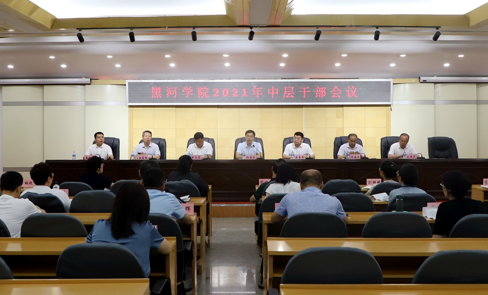 本网讯(记者 赵宇 摄影 郭瑞)7月14日,学校在明德楼五楼多功能厅召开2021年中层干部会议,党委班子成员,各学院、各部门负责人参加会议。会议由党委副书记、校长杨敬民主持。