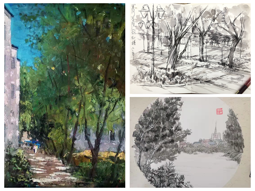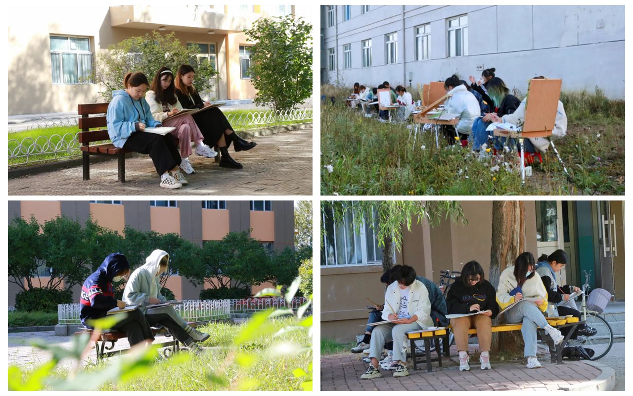 第一届党代会以来,美术与设计学院围绕学校办学定位,以社会需求为导向,以“突出应用”和“服务地方”为宗旨,紧紧抓住责任、创新和实践三个人才培养着力点,逐渐探索出了一条适应地方经济社会发展需求的应用型人才培养新模式。校园写生,是美术与设计学院探索疫情防控情况下,培养应用型人才的一次重要实践教学活动。师生们背上画袋、拿上画材,在“最是橙黄橘绿时”穿梭于校园的“三把钥匙”旁、月牙湖畔和教学楼宇间,用发现美的眼睛与描绘美的画笔记录下黑河学院的一草一木、一花一景,用笔墨油彩记录北疆校园五年来的新变化、新发展,喜迎学校第二次党代会的召开。