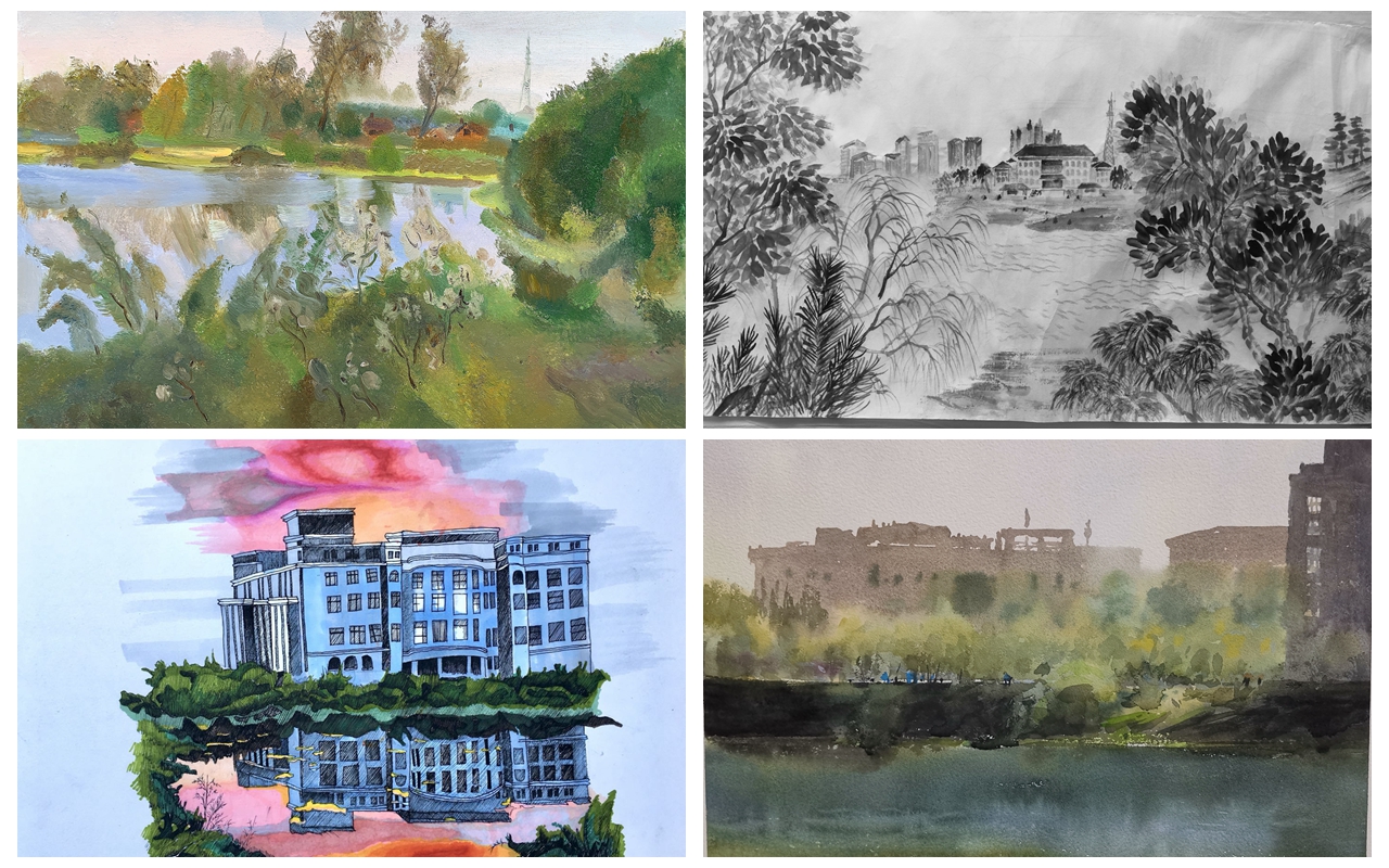 “虽然因为疫情影响不能实现外出写生的计划,但在此次写生中,让我发现了平时生活中学校真的有很多的美被我们所忽略,我们可以直接抒发感情,抒发对学校的热爱,画出一幅幅展现校园风光的作品,这是外出写生所不能带给我们的。”美术学专业的孙畅感慨道。“在写生过程中,我更加感受到了校园的美。优美的建筑轮廓线,月牙湖边沙沙舞动的水草,在光和影作用下色彩斑斓的校园。我们把写生和创作有机结合起来,用校园的一块砖、一片叶、一草、一木、一束光,来表达自己的情感体会以及独特的艺术语言和风格追求。”视觉传达专业的赵蕊说。“写生可以让我们进一步锤炼基本功,搜集素材,储备灵感,提高了绘画的塑造能力,对色彩的表现能力,审美的能力和对意境的感受,还让我们更深刻感受到了平时生活和学习的校园别样的美丽。”环境设计专业的耿春辉说。专业写生绘不尽的是对校园的热爱,校园的每一处风景,每一个建筑在学生们的笔下,都是最美的样子,他们正以实际行动向学校第二次党代会献礼。