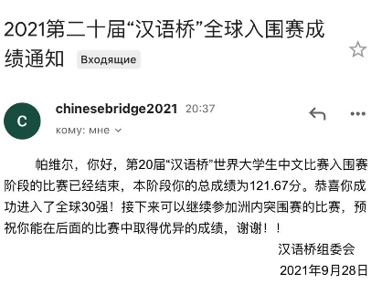 9月28日,2021第二十届“汉语桥”世界大学生中文比赛全球入围赛30强名单出炉。我校与俄罗斯布拉戈维申斯克国立师范大学合作共建的布拉戈维申斯克国立师范大学孔院学员帕维尔·亚历山德罗维奇代表俄罗斯哈巴罗夫斯克领区参赛,并以总成绩121.67分进入全球30强,创造出俄罗斯远东地区历史最好成绩,充分展现了孔子学院出色的汉语教学成果和学员们良好的精神风貌。