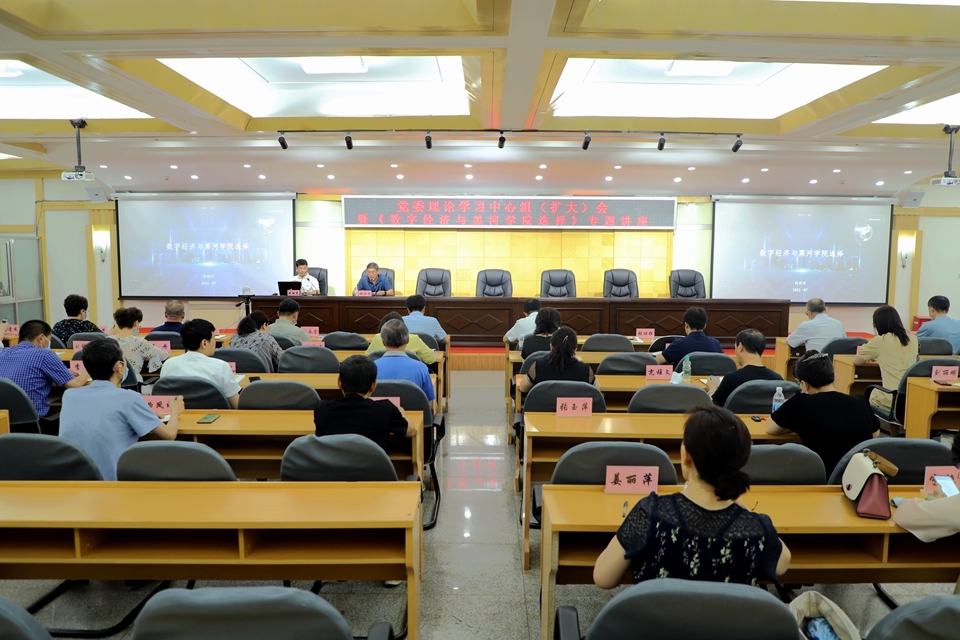 本网讯(记者 王静 摄影 郭瑞)为贯彻落实省第十三次党代会精神,深入开展“能力作风建设年”活动,结合“解放思想、振兴发展”专题研讨安排,7月5日,学校在明德楼五楼多功能厅举行党委理论学习中心组第五次(扩大)会暨《数字经济与黑河学院选择》专题讲座,特邀哈尔滨商业大学商务经济系主任、数字经济系主任韩朝亮博士作辅导讲座。会议采取线上线下相结合方式进行,校党委班子成员、正处级以上干部在主会场参会;副处级干部,系主任、副主任,学科专业带头人线上参会。会议由党委副书记、工会主席张焕强主持。