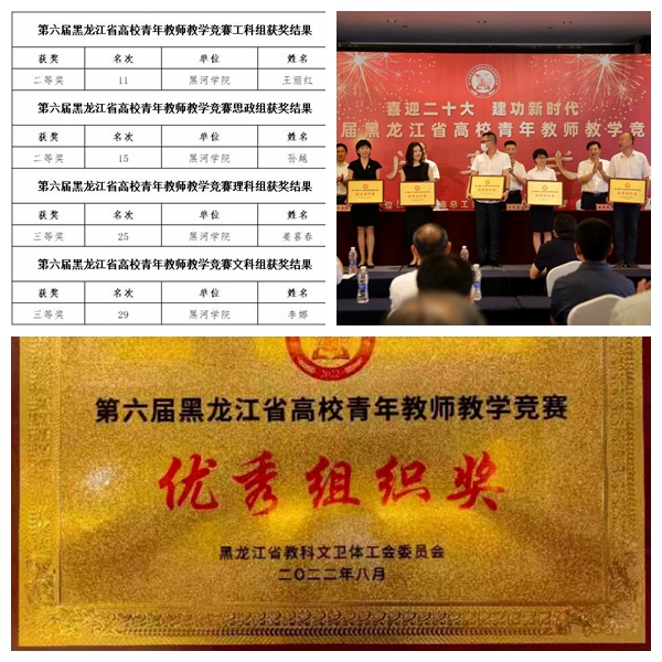 本网讯(特约记者 王虹丹)8月17日,由黑龙江省总工会、省教育厅联合举办的“喜迎二十大 建功新时代”第六届黑龙江省高校青年教师教学竞赛落下帷幕,我校计算机与信息工程学院王丽红老师、马克思主义学院孙越老师分获工科组、思政组二等奖,理学院姜喜春老师、文化旅游学院李娜老师分获理科组、文科组三等奖。我校荣获优秀组织奖。在获奖层次和获奖数量上实现了历史性的突破,充分体现了我校教育教学改革成效,彰显了青年教师课堂教学风采。