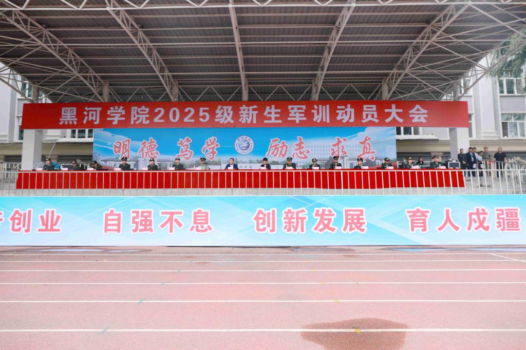 随着国歌奏响,五星红旗在运动场冉冉升起,全体人员肃立行注目礼,大会在庄严的升旗仪式中拉开序幕。带队教官随后宣读《黑河学院2025级新生军训计划》及《考核评比办法》,从军事技能训练到国防理论学习,详细部署军训期间的教学安排与考核标准,为新生明确训练方向。授旗环节中,承训部队领导向谢慧授予"军训大队旗",谢慧依次为各学院授"军训中队旗"。