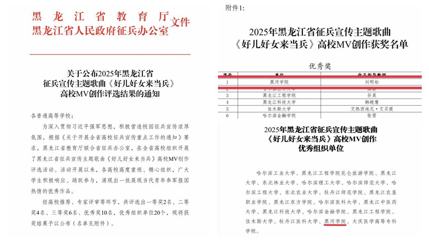 近日,黑龙江省教育厅与黑龙江省人民政府征兵办公室联合下发《关于公布2025年黑龙江省征兵宣传主题歌曲〈好儿好女来当兵〉高校MV创作评选结果的通知》,对在全省高校MV创作评选活动中获奖的单位与个人予以通报表彰。学校荣获“优秀组织单位”称号,学校音乐学院2022级音乐表演专业学生刘明松荣获“优秀奖”。
