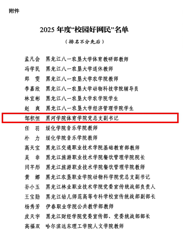 近日,中共黑龙江省委网络安全和信息化委员会办公室与黑龙江省教育厅联合发布《关于表扬黑龙江省2025年度“校园好网民”的通报》,我校体育学院党总支副书记邹积恒荣获黑龙江省2025年度“校园好网民”荣誉称号。