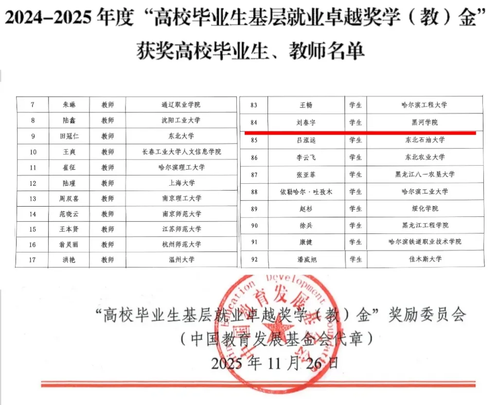 全国418名毕业生获此奖项,黑龙江省仅有10名同学获奖。此次获奖,既是对刘春宇同学扎根基层、实干笃行、建功立业的高度肯定,也充分彰显了我校在基层就业宣传引导、人才培养等方面的扎实成效。这是我校学子继2023—2024年度后,再度斩获此项荣誉,充分体现了学校育人成果的持续性与稳定性。
