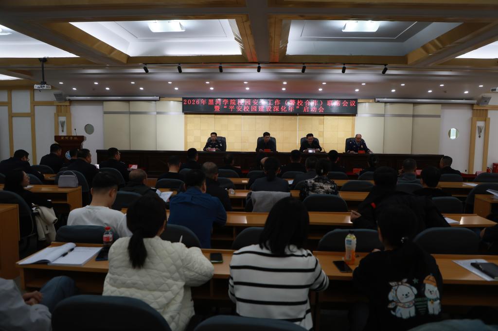 会上,崔永均、田军分别结合工作职能,就深化警校合作,推进平安校园建设作出专业部署,为学校安全工作开展提供精准指导;学校保卫处相关负责人宣读《2026年黑河学院校园安全稳定工作要点》,学生工作部、教务处、后勤管理处、人文传媒学院及保安公司相关负责人依次作校园安全工作经验交流,各单位的经验做法兼具针对性与借鉴性,为校内安全管理工作夯实基础。