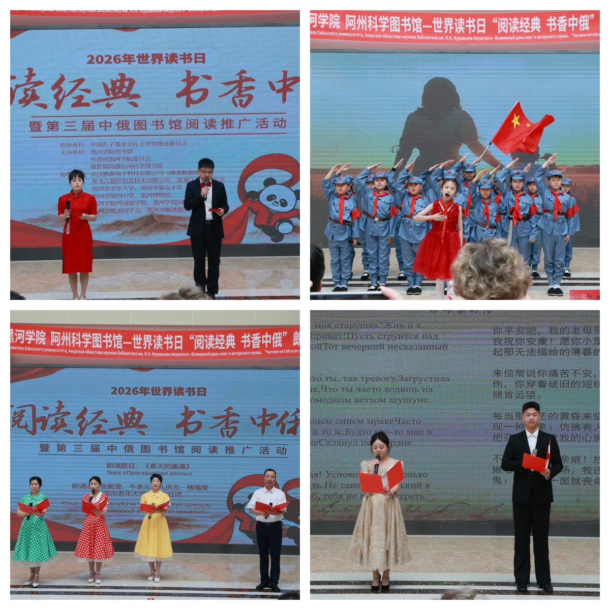 4月23日,正值第31个“世界读书日”,“阅读经典 书香中俄”第三届中俄图书馆阅读推广活动在我校图书馆成功举办。本次活动由校图书馆、共青团黑河学院委员会、俄罗斯阿穆尔州科学图书馆联合主办,武汉鼎森电子科技有限公司(博看数据库)、黑龙江超星信息技术有限公司、黑河市第五小学、黑河市老年大学、黑河市第四中学、黑河博物馆、黑河学院外国语学院、黑河学院国际教育学院、黑河市朗读者沙龙、黑河市欧美同学会予以协办。活动采用线上线下同步、中俄双语展演的形式,续写了两国图书馆文化交流的崭新篇章。