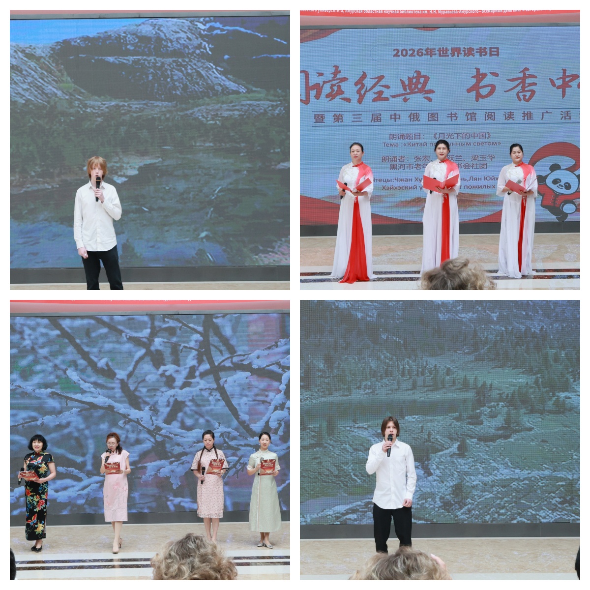 本次双语朗读展演亮点纷呈,来自黑河市第五小学、第四中学、老年大学、朗读者沙龙、黑河博物馆以及黑河学院外国语学院、国际教育学院的选手,与俄罗斯朗读者同台献声。大家用中文与俄语互换诵读,演绎《永恒的红色诗篇》《月光下的中国》《读中国》《诗词歌赋里的中华》《假如生活欺骗了你》《冬天的早晨》等中俄经典篇目,以声传情、以文会友,展现两国文学经典的独特魅力与文化底蕴。整场展演语言互通、情感共鸣,现场掌声不断,营造出跨越国界的浓郁书香氛围。