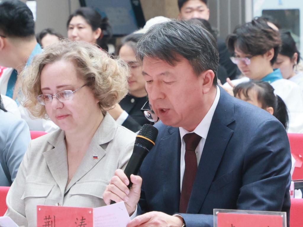 开幕式上,学校党委委员、副院长荆涛致辞,他表示,“阅读经典 书香中俄”双语朗读活动历经三年深耕,已成为中俄图书馆联盟框架下的特色文化交流品牌,学校将依托平台优势,持续深化与俄罗斯阿穆尔州科学图书馆等机构合作,以阅读为纽带促进中俄文化互鉴,为增进两国人民世代友好贡献高校力量。阿穆尔州科学图书馆馆长普拉斯科娃·奥克桑娜·谢尔盖耶夫娜表示,本次阅读推广活动在促进中俄文化交流、增进两国人民友谊方面发挥了重要作用,期待以多年合作成果为坚实基础,持续深化中俄两国在图书馆现代化建设、阅读文化推广、数字资源共建共享、人才交流培养等领域的全方位务实合作,推动中俄图书馆界交流合作迈向更高水平。