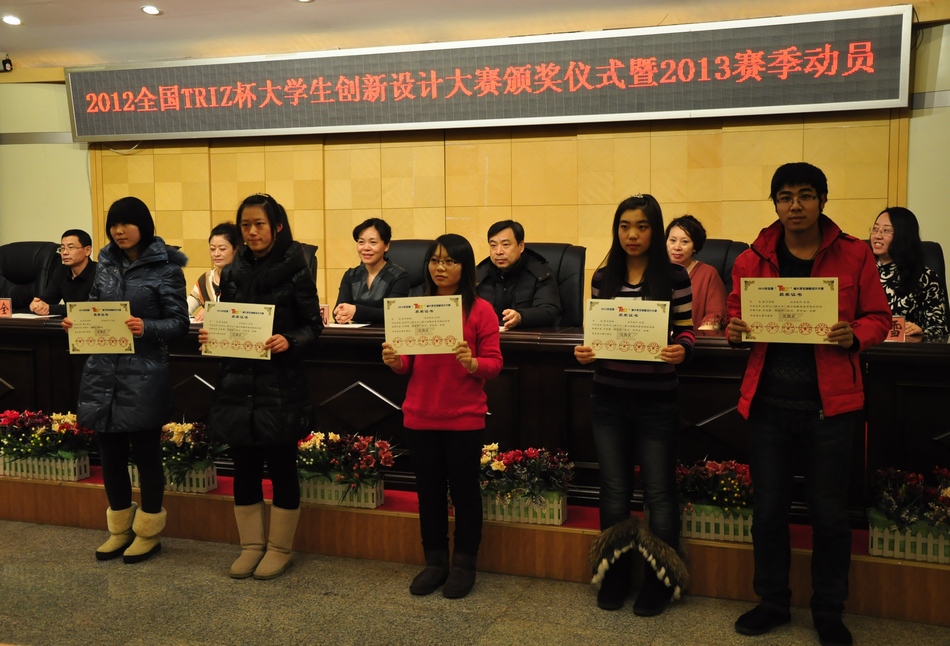 会上公布了2012全国TRIZ杯大学生创新设计大赛获奖名单。物理化学系高东波等同学的科技发明制作《莫比乌斯尺》、张茹月等同学的论文《基于TRIZ的La2-xBaxCuO4和La1-xBaxFeO3催化分解NO研究》、计算机科学与信息工程系崔锴等同学的科技发明制作《新型自行车挡泥板》荣获二等奖;计算机科学与信息工程系白琳等同学的科技发明制作《神奇的电脑包》荣获三等奖;物理化学系马占元、连荫杰、董玉金等同学的科技发明制作《震动储能仪》、《魔力背包》、《房屋温度湿度自动控制系统》、肖佳薇等同学的论文《应用TRIZ理论对乙酰水杨酸制备实验的改进》,数学系张新玲、王超等同学的科技发明制作《自生多用的太阳能小屋》、《保健拖鞋》荣获优胜奖。参会领导向获奖学生颁发了证书,学院对获奖团队进行了奖励。