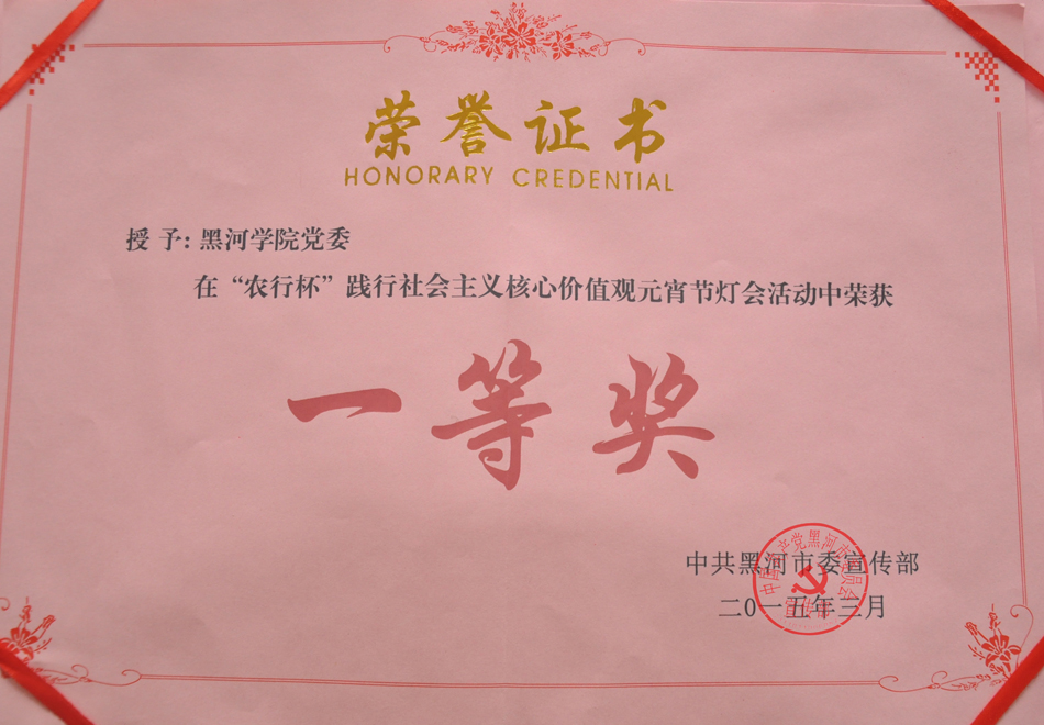 本网讯(记者 王佳)3月30日,2015年春节、元宵节系列文化活动表彰大会在黑河市执法局举行。黑河学院党委在“农行杯”践行社会主义核心价值观元宵节灯会活动中荣获一等奖。