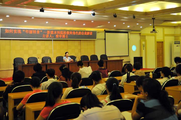 本次讲座由中国语言文学系主任柴华博士主讲。此次讲座立足于我校当前发展现状,结合个人日常工作的感受和体验,从每个教师面临的实际问题出发,旨在交流心得,探讨高校教师如何实现自我提升的途径等问题。