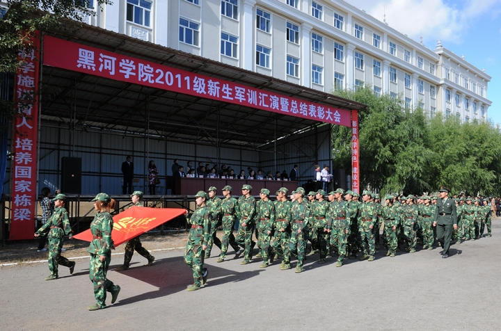 伴随着雄壮的《中华人民共和国国歌》,大会正式开始,2011级新生进行了分列式等项目的军训成果汇报表演,他们口号响亮、步伐铿锵、英姿飒爽,向领导和教师汇报了14天军训的丰硕成果,军训表演博得了领导和教师们的阵阵掌声。汇演期间,为了表达学校对黑河军分区和全体承训官兵的真挚谢意,副校长杨宏代表学校向黑河船艇大队赠送了题为“共建传友谊 军训塑英才”的锦旗。
