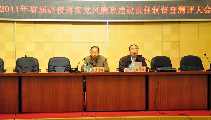 上午8时30分,在综合楼五楼多功能厅,召开学院2011年省属高校落实党风廉政建设责任制督查测评大会。学院党政领导班子、副处级以上干部、副教授以上教师、人大代表、政协委员、民主党派负责人和离退休人员代表参加了大会。大会由学院党委书记曲伟建主持。