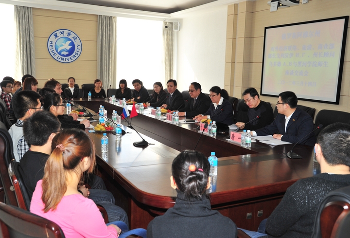 本网讯(记者 王佳 学生记者 越冬梅)学院对俄交流合作工作的丰硕成果得到俄阿穆尔州政府的极大关注。3月14日,阿穆尔州对外经济联络、旅游与商业部部长戈列沃伊与阿穆尔州州长顾问乌多德来到学院与学院领导及俄语专业学生就中俄青年交流工作进行了广泛座谈。学院副院长宋立权、黑河市外事侨务办公室副主任于春利、外事侨务办公室领事科科长邢国文以及学院宣传统战部、外事处、俄语系等相关部门负责人参加了座谈会。