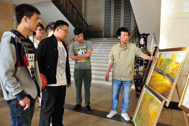 本网讯(学生记者 燕湛魁 摄影 林志超)日前,我院美术系10级学生王金超个人油画展在综合楼一楼大厅隆重开展,学院副院长杨宏、宋立权、吕巧凤亲临现场参观并给予高度评价。