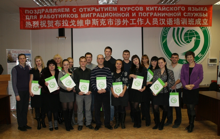 本网讯(特约记者 王健霖)11月8日,俄罗斯布拉戈维申斯克国立师范大学孔子学院举办涉外汉语培训班开班仪式,为当地俄边检、海关、移民局的26名工作人员进行为期半年的免费汉语培训。