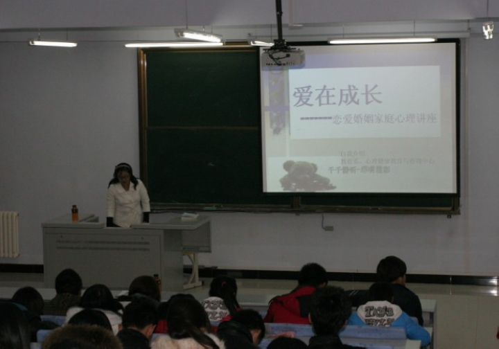 本网讯(通讯员 车艳竹)11月29日晚,以“爱在成长——恋爱、婚姻、家庭”为主题的大学生心理讲座在我院教学楼A309成功举行。讲座由院心理健康与咨询中心张学英教授主讲,历史文化旅游系200余名学生聆听了讲座。