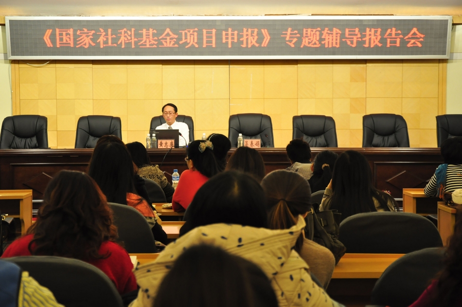 本网讯(特约记者 于凤丽)为提高我省高校国家社科基金项目申报中标率,省哲学社科规划办组织了我省社科专家高校巡讲活动。12月17日,国家社科基金项目申报专题辅导报告会在我院综合楼五楼多功能厅举行。国家社科基金学科评审组专家、教育部人文社科规划项目评委、黑龙江大学翻译科学研究院院长、博士生导师黄忠廉教授来到我院作专题辅导报告。报告会由科研处负责人主持,我院各系(中心、部、研究所)、各部门120余名教师参加了报告会。