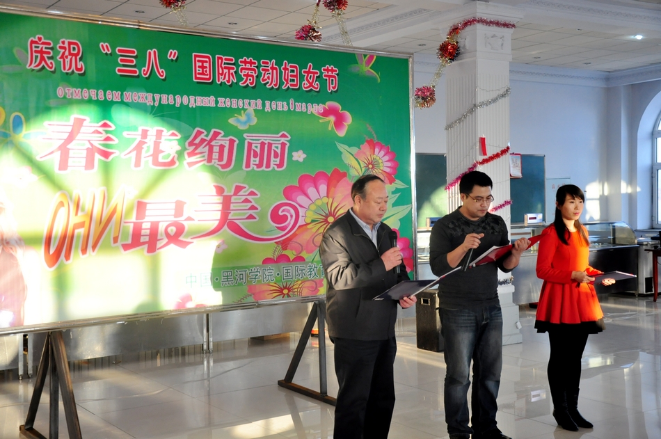 本网讯(特约记者 宋菲)为庆祝第103个“三·八”国际劳动妇女节,3月7日下午,国际教育交流合作中心在留学生餐厅举办了中外教师“春花绚丽你最美”庆祝“三·八”国际劳动妇女节主题联欢活动。学院党委书记曲伟建、副院长宋立权、车永宏及布拉戈维申斯克市职业技术中专校长尼克莱·瓦西里耶维奇、副校长阿克桑娜出席活动。