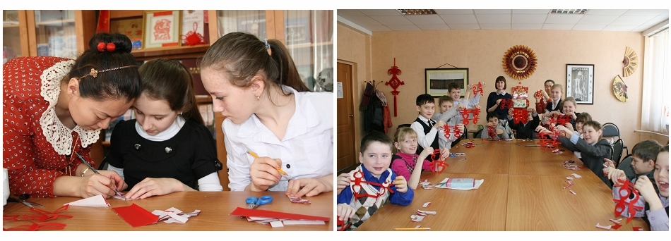 李平老师通过幻灯片、图册向俄罗斯学生介绍了中国剪纸艺术的历史、类型、基本方法和代表作品,就“双喜”、“花朵”和“窗花”的剪法向同学们进行了详细讲解。经过现场讲解与指导很快学生们就掌握了具体的剪纸要领,一幅幅美丽的剪纸作品从同学们稚嫩的手中裁出,他们脸上洋溢着喜悦的笑容。