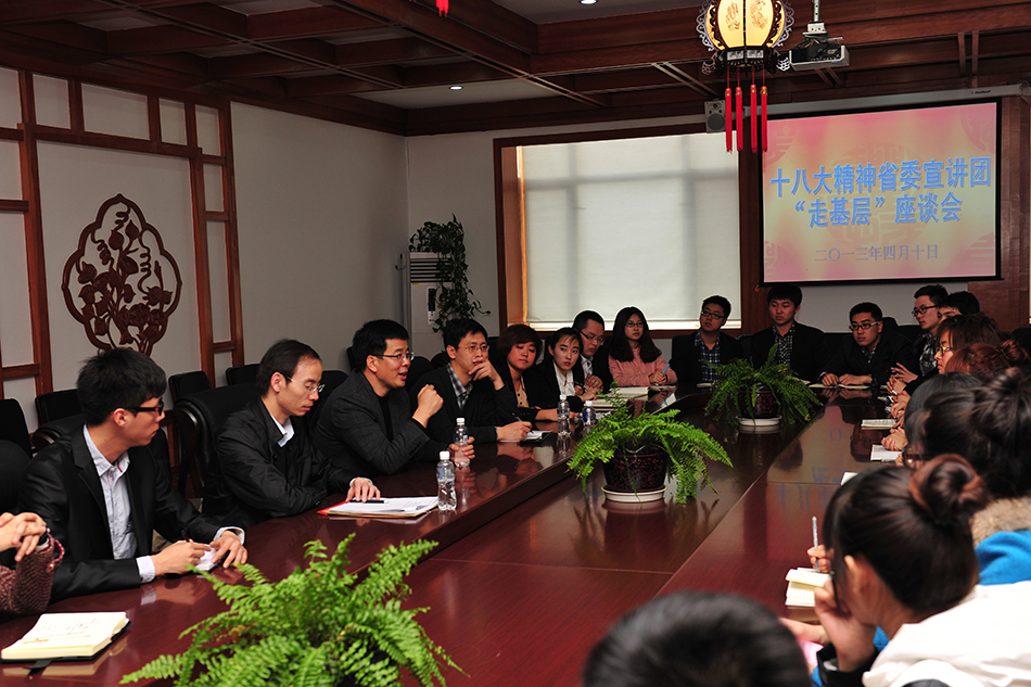本网讯(学生记者李玉秀摄影林志超)4月10日,十八大精神省委宣讲团“走基层”座谈会在我院三楼会议室举行,全院50余名学生代表参加了座谈会。