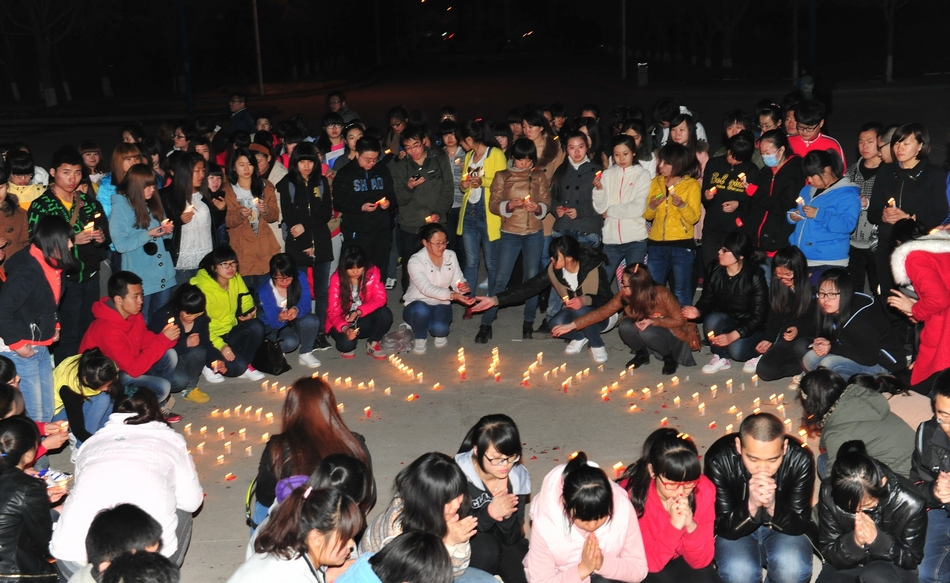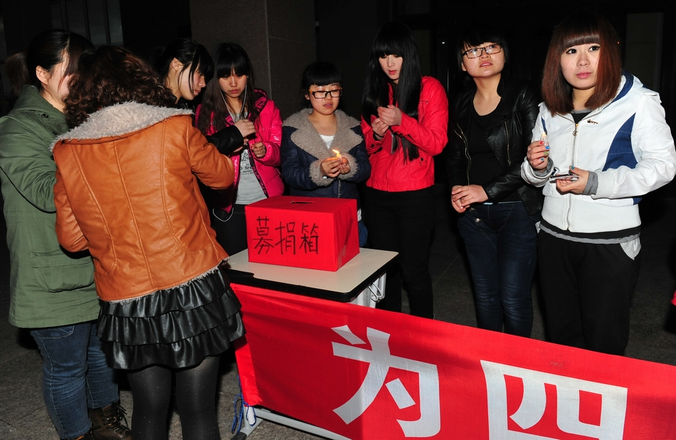 本网讯(学生记者李玉秀摄影张维超笪鹏)北京时间2013年4月20日8时02分四川省雅安市芦山县(北纬30.3,东经103.0)发生7.0级地震,成都、重庆及陕西的宝鸡、汉中、安康等地均有较强震感。据雅安市政府应急办通报,震中芦山县龙门乡99%以上房屋垮塌,卫生院、住院部停止工作,停水停电。在地震的第二天,由我院美术系汝红伟等十六名学生组织的主题为“为四川祈福,雅安不哭”的爱心募捐活动在综合楼门前举行,来自全院各系的800余名学生参加了本次活动。