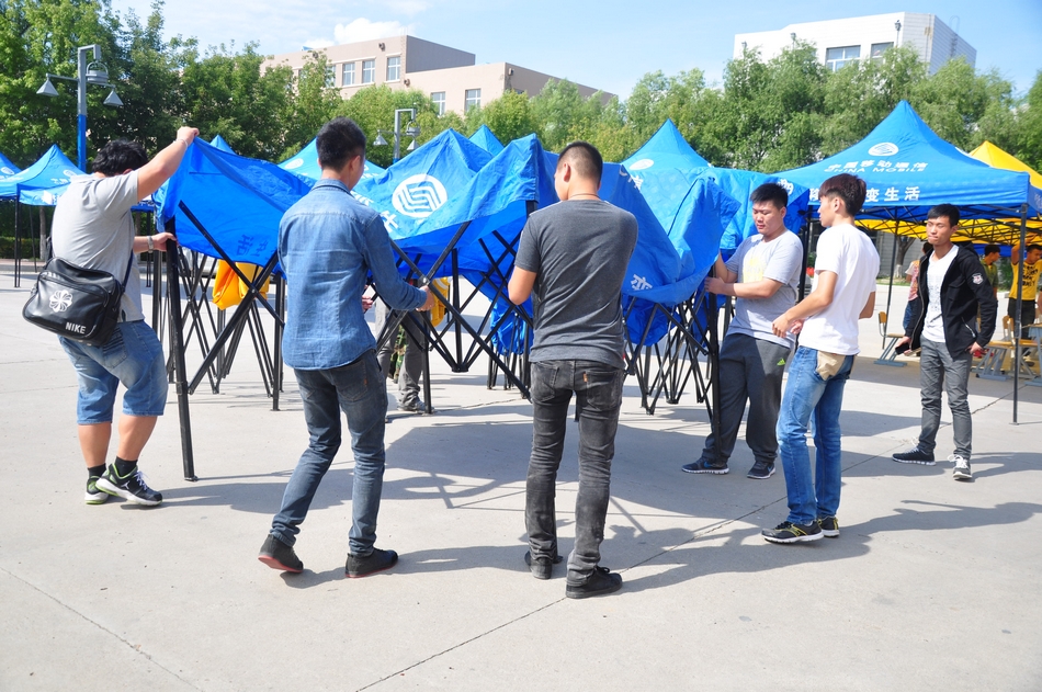 9月6日,经济管理系、体育系学生志愿者在明德楼(综合楼)门前主动为各系搭建迎新帐篷,为迎新准备工作贡献力量。