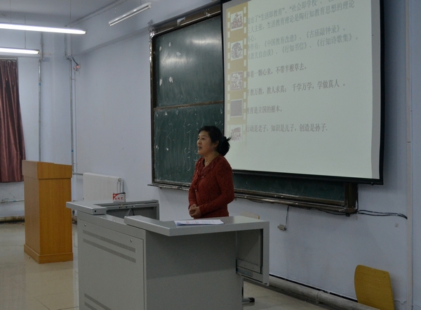 讲座由教育系党总支书记张学英主讲,她从陶行知青年的求学之路、教育的6个阶段以及各界学者对陶行知的研究三个角度深刻阐述了陶行知先生的教育思想。