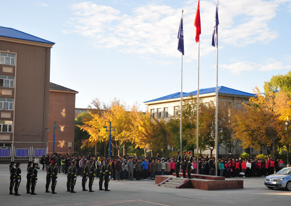 本网讯(特约记者 梁云婴 摄影 大学生记者团柳天舒)11月4日清晨6:30分,黑河学院物理化学系310名同学在明德楼门前举行隆重而庄严的升国旗仪式。迎着灿烂的朝阳,由36名学院国旗护卫队队员组成的护旗方队,迈着整齐的步伐,护送着鲜艳的五星红旗行进至升旗台。伴着庄严雄壮的国歌声,五星红旗冉冉升起、迎风飘扬,全体师生目视国旗、高唱国歌。