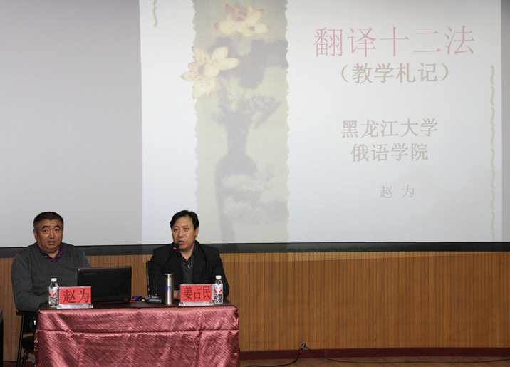 本网讯(特约记者 李红娟)11月22日下午,应俄语系的邀请,黑龙江大学俄语学院赵为教授在俄语楼小剧场为俄语系师生做了题为《翻译十二法》的讲座。俄语系党委书记孟繁红,副主任王晓梅和俄语系广大师生参加了本次讲座,讲座由俄语系主任姜占民教授主持。