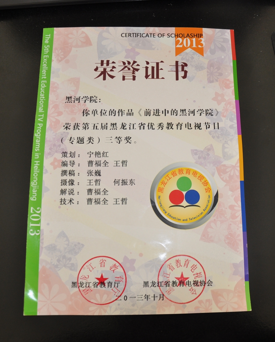 本网讯(记者 何振东)11月29日—30日,黑龙江省教育电视协会年会暨第五届黑龙江省优秀教育电视节目颁奖仪式在东北农业大学隆重召开。由我院选送的作品《前进中的黑河学院》在全省160余件参赛作品中脱颖而出荣获教育电视(专题类)三等奖。