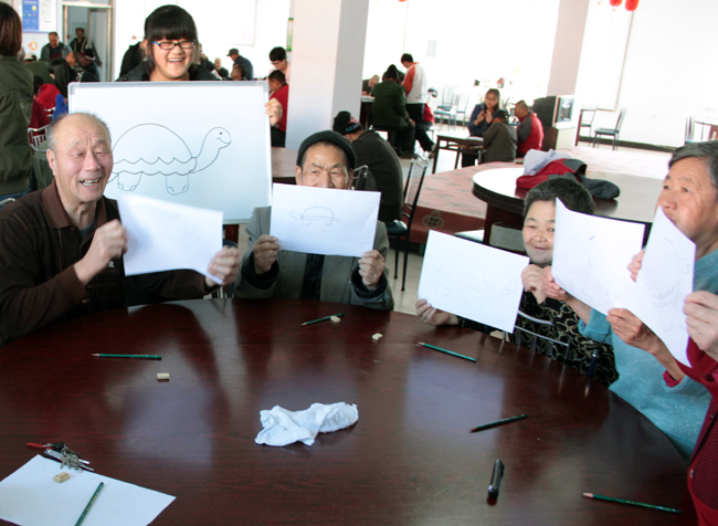 本网讯(特约记者 梁云婴 孔丽)为进一步弘扬中华民族尊老、爱老、助老的传统美德,培育和践行社会主义核心价值观,3月23日,院学生会学生青年志愿者、英语系学生和爱辉区中心敬老院社会督导员、团委教师来到爱辉区中心敬老院,探望老人并和老人们一起画简笔画。