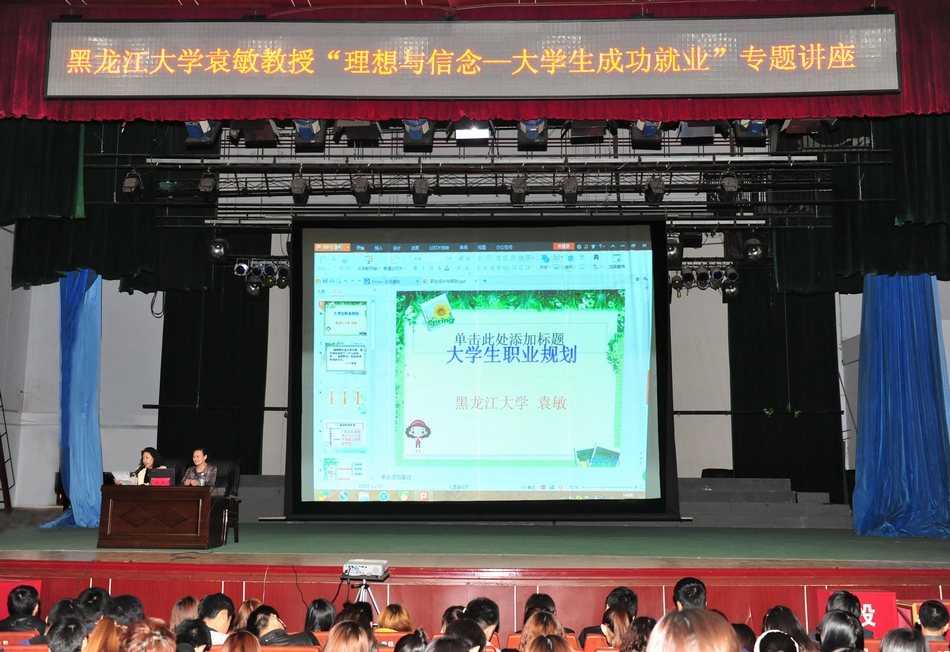 本网讯(记者 何振东)4月9日下午,应学院美术系邀请,黑龙江大学教授、硕士研究生导师袁敏教授在明德楼礼堂为我院大学生作了一场题为“理想与信念—大学生成功就业”的精彩讲座。讲座由美术系党总支书记姜丽萍主持,美术系近千名学生参加讲座。