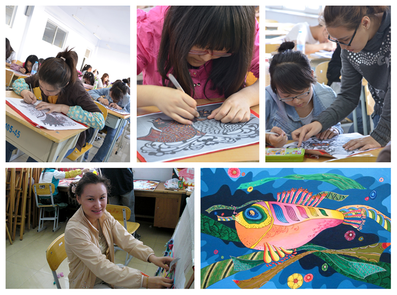 桌面上摆着一张张用刻刀刻出的独具朴素而夸张美感的纸片,这正是剪纸课的课堂。同学们手握刻刀,专心致志地对自己桌前的卡纸进行仔细的镌刻,生怕自己下手太重,破坏了整个作品的美感。作为剪纸课程的讲师马辉任职黑河学院美术系,是传媒教研室装饰绘画专业教师,在教学中,总是手把手地教学生握刀、运用技巧,并亲自做示范。2013级汉语国际教育专业的同学们上剪纸课十分活跃,她们都说“感觉像回到了小时候剪窗花的时候,特别温馨”。在老师的帮助下,学生们剪出多姿多彩的作品,有花草、虫鱼、鸟禽和人物,这些剪纸不仅表现了我们所熟悉的事物,也反映了学子丰富的艺术想象力。