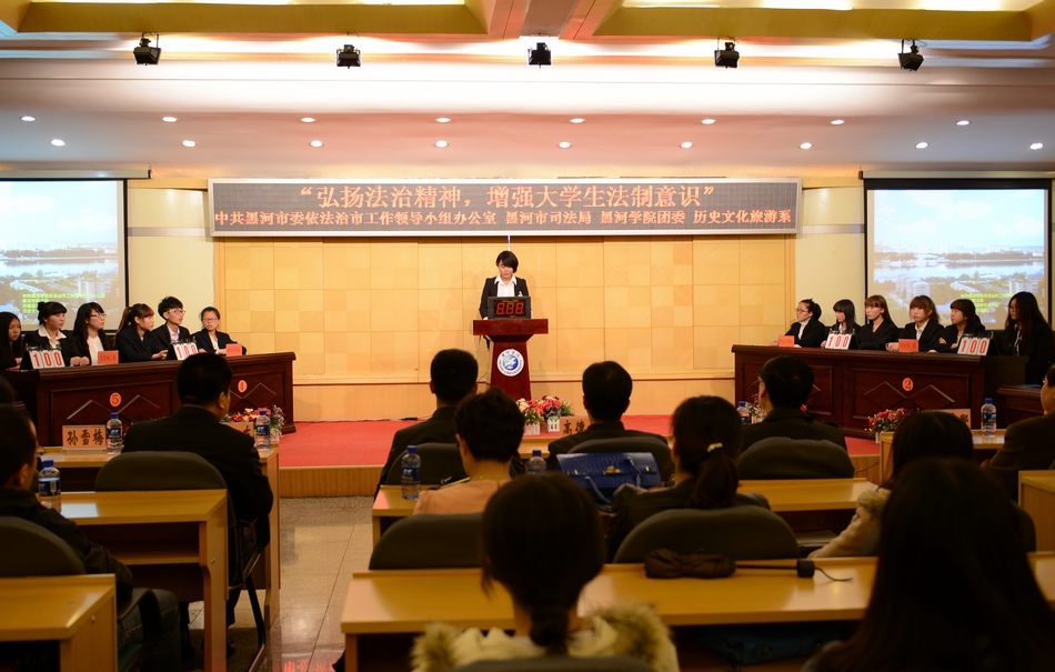 本网讯(记者 何振东 学生记者 李妍)5月14日下午,由黑河市委依法治市工作领导小组办公室、黑河市司法局、黑河学院团委主办,黑河学院历史文化旅游系承办的“弘扬法治精神,增强大学生法制意识”法律知识竞赛决赛在我院明德楼五楼多功能厅举行。